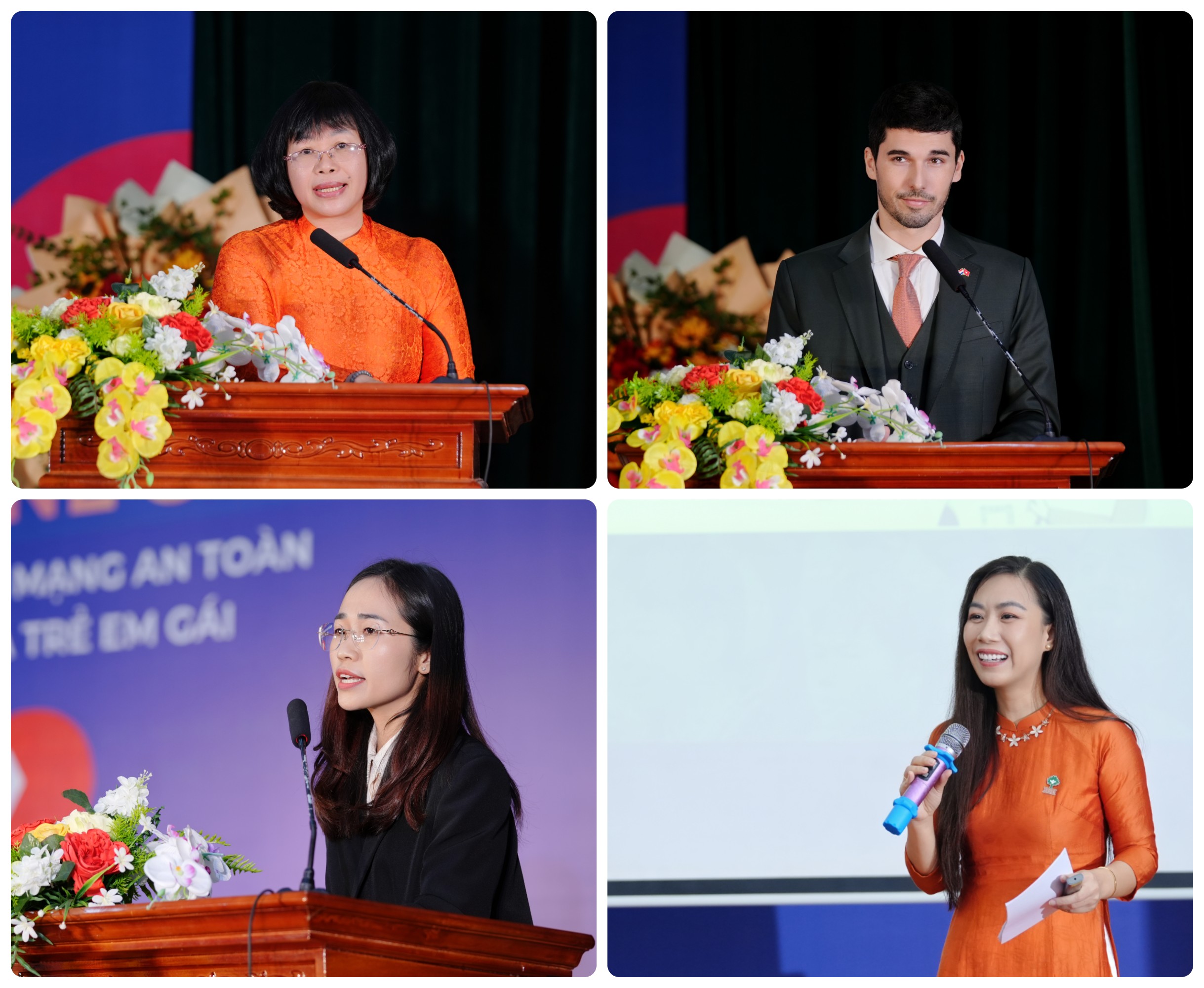 Đại diện Đại sứ quán Hà Lan, ông Tomas Königs, bày tỏ sự ủng hộ đối với các sáng kiến thúc đẩy bình đẳng giới và an toàn số, đánh giá cao mô hình giáo dục kết hợp trải nghiệm thực tế tại chương trình. Trong bài chia sẻ chính, bà Nguyễn Phương Linh giới thiệu mô hình “Vaccine số” với ba cấu phần gồm hiểu biết số, kỹ năng số và giá trị số, nhấn mạnh tầm quan trọng của việc trang bị năng lực số toàn diện giúp phụ nữ, trẻ em gái nhận diện nguy cơ, bảo vệ thông tin cá nhân và ứng xử văn minh trên môi trường mạng.