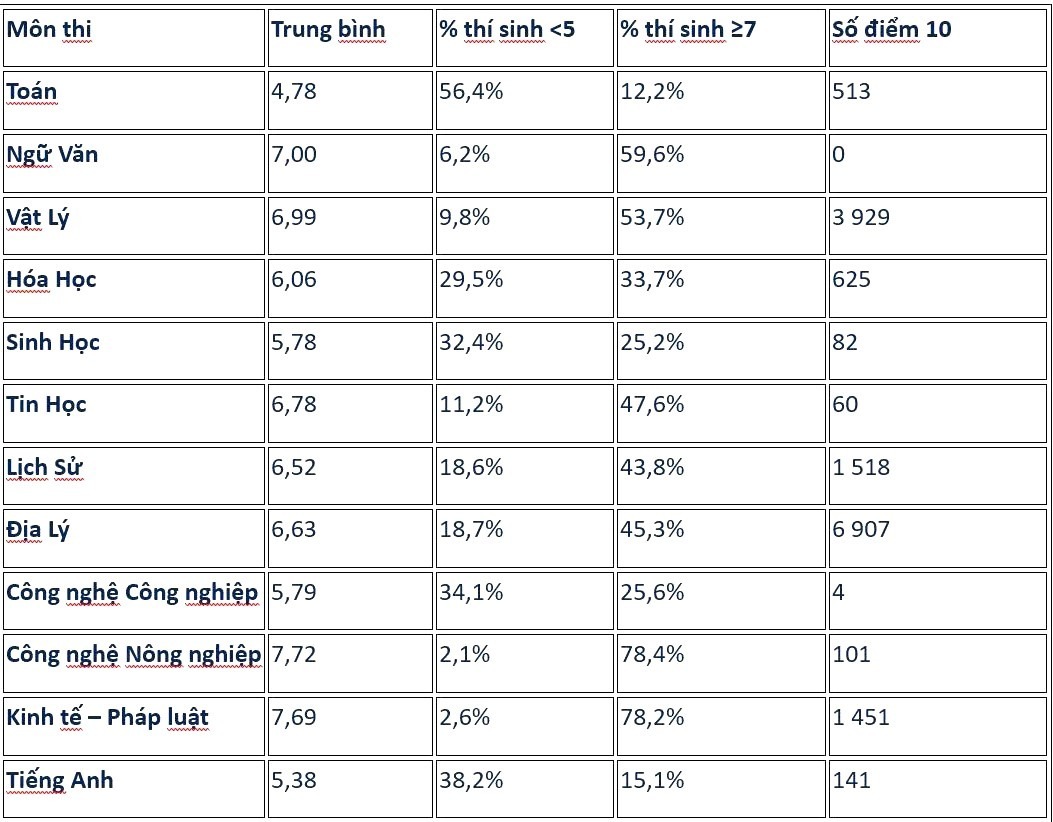 Toán có trung bình thấp nhất (4,78) và tỷ lệ học sinh dưới 5 điểm lên tới 56,4%, dù vẫn ghi nhận 513 điểm 10, cho thấy đề thi phân hóa rất sâu.