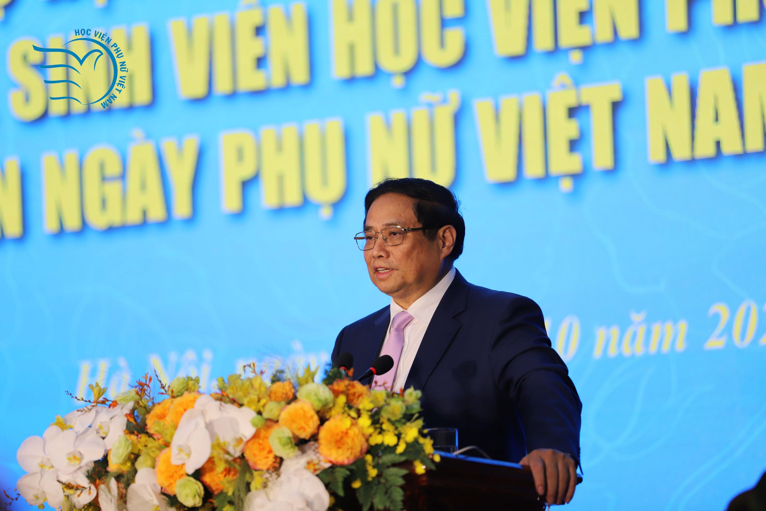 Thủ tướng Phạm Minh Chính phát biểu tại buổi gặp gỡ cán bộ Hội LHPN Việt Nam, viên chức, người lao động và sinh viên Học viện Phụ nữ Việt Nam