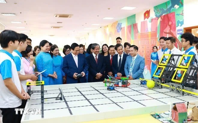 Thủ tướng Phạm Minh Chính trải nghiệm điều khiển robot tại Học viện Phụ nữ Việt Nam. (Ảnh: Dương Giang/TTXVN)