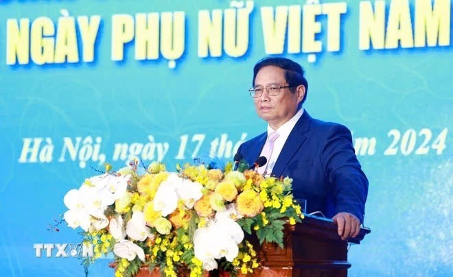 “Ở bất cứ nơi đâu, trong bất cứ ngành nghề, lĩnh vực nào của đất nước, đều có sự hiện diện và vai trò to lớn, đóng góp bền bỉ, không mệt mỏi của chị em phụ nữ,” Thủ tướng khẳng định.