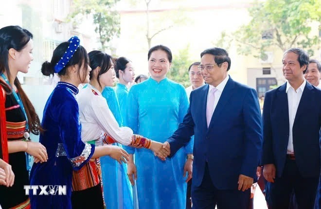 Thủ tướng Phạm Minh Chính đến thăm, chúc mừng giảng viên, sinh viên Học viện Phụ nữ Việt Nam. (Ảnh: Dương Giang/TTXVN)