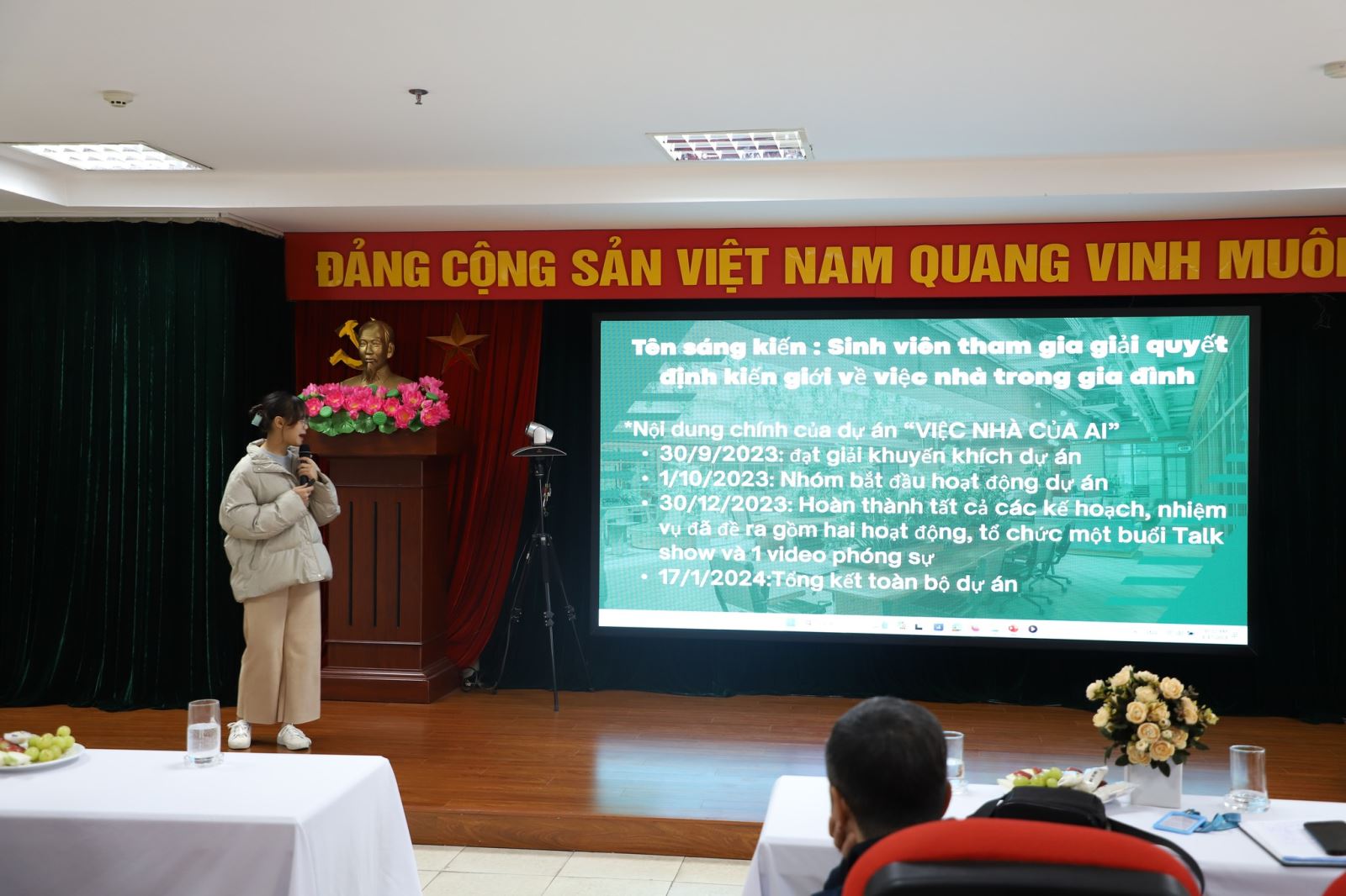 Sinh viên Mai Thị Lành – K8 Giới và Phát triển – Báo cáo kết quả sáng kiến của đội giải nhất: “Những nốt trầm trong sách giáo khoa”; Sinh viên Phạm Thị Thiết – Phó CN CLB Sinh viên hành động vì bình đẳng giới và phát triển bền vững báo cáo kết quả sáng kiến của đội giải nhì: “Dũng cảm trên con đường ngược chiều, để em vẽ trọn vẹn những giấc mơ”; Sinh viên Đặng Thanh Tùng – K8 Giới và Phát triển báo cáo kết quả sáng kiến của đội giải ba: “Ở đâu có sạn giới, ở đó có thanh niên”; Sinh viên Đỗ Thị Hồng Nhung – K9 Truyền thông đa phương tiện báo cáo kết quả sáng kiến của đội giải khuyến khích: “Sẽ ra sao nếu người nam là nữ và người nữ là nam?”; Sinh viên Lê Hà – Đội CNTT và QTKD báo cáo kết quả sáng kiến của đội giải khuyến khích: “Việc nhà cho ai?”.