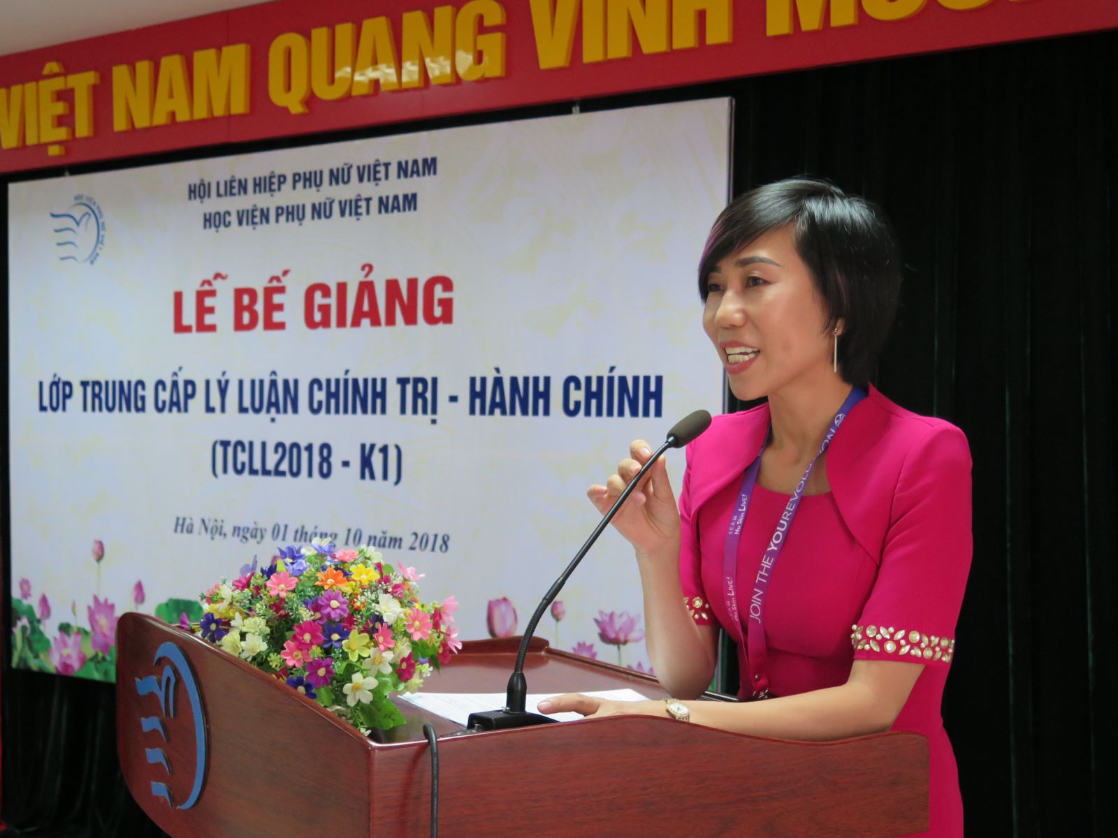 Tại buổi lễ, Ths. Vũ Thị Bích Đào – Giáo viên chủ nhiệm lớp đã báo cáo tổng kết tình hình học tập của lớp Trung cấp lý luận Chính trị – Hành chính khóa 1 năm 2018. Khóa học được tổ chức nhằm trang bị cho học viên những kiến thức cơ bản và cần thiết về lý luận chính trị – hành chính; củng cố, nâng cao bản lĩnh chính trị, phẩm chất đạo đức, trình độ lãnh đạo, quản lý; kỹ năng tổ chức thực hiện nhiệm vụ được Đảng, Nhà nước và nhân dân giao phó. Với đặc thù của lớp học có 100% học viên trình độ đại học và trên đại học, thuộc diện cán bộ quy hoạch của các đơn vị, tuổi đời trung bình là 41 tuổi. Bên cạnh những thuận lợi cơ bản là được lãnh đạo các đơn vị cử đi tạo điều kiện, giảng viên lớp học là những người có kinh nghiệm và thời gian học phù hợp với đặc thù thì cũng còn không ít khó khăn như phải vừa làm vừa học trong điều kiện nhiệm vụ được giao không được ảnh hưởng. Theo đó, kết thúc khóa học đã có 02 học viên đạt loại Giỏi chiếm tỷ lệ 3%; loại Khá: 65 học viên chiếm tỷ lệ: 97%.
