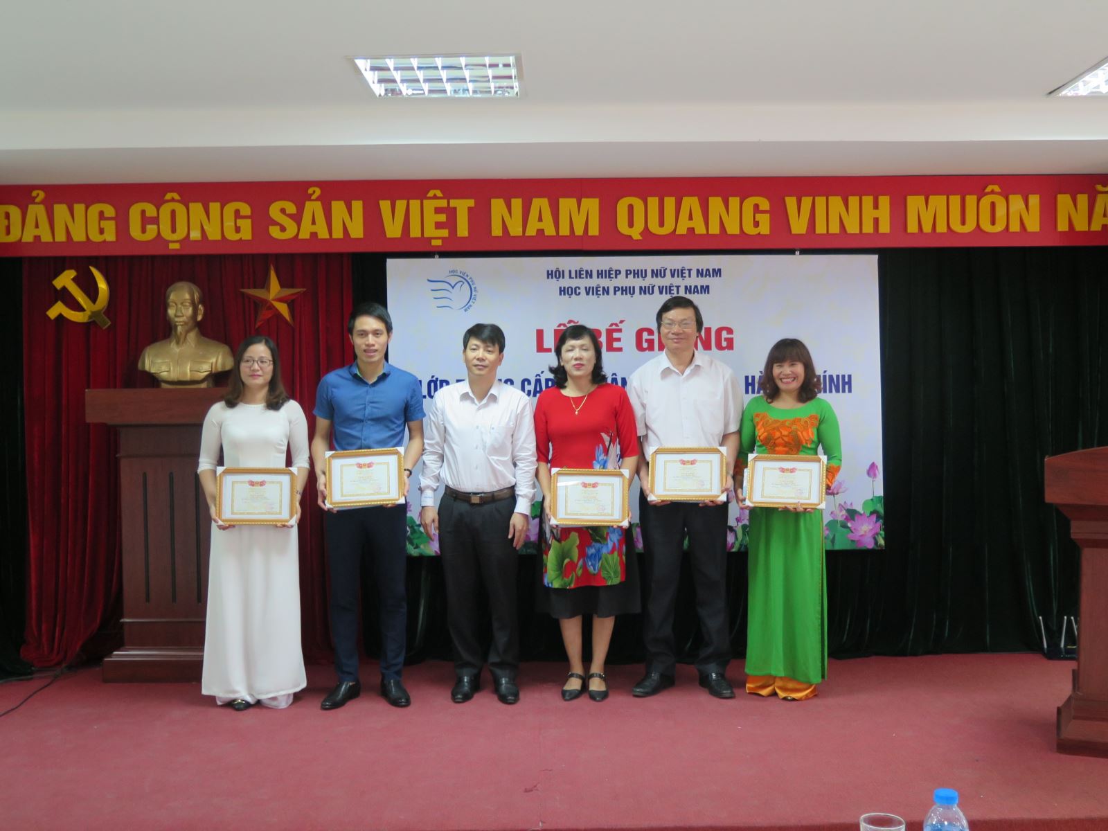 Tham dự lễ bế giảng có TS. Trần Quang Tiến – Giám đốc Học viện, TS. Dương Kim Anh – Phó Giám đốc Học viện, lãnh đạo các khoa, phòng, trung tâm của học viện và tập thể 67 học viên là cán bộ/ cán bộ nguồn của Học viện Phụ nữ Việt Nam, các Ban TW Hội LHPN, các sinh viên đang học tại Học viện, các cán bộ đang công tác tại các Bộ, ngành tại Hà Nội.
