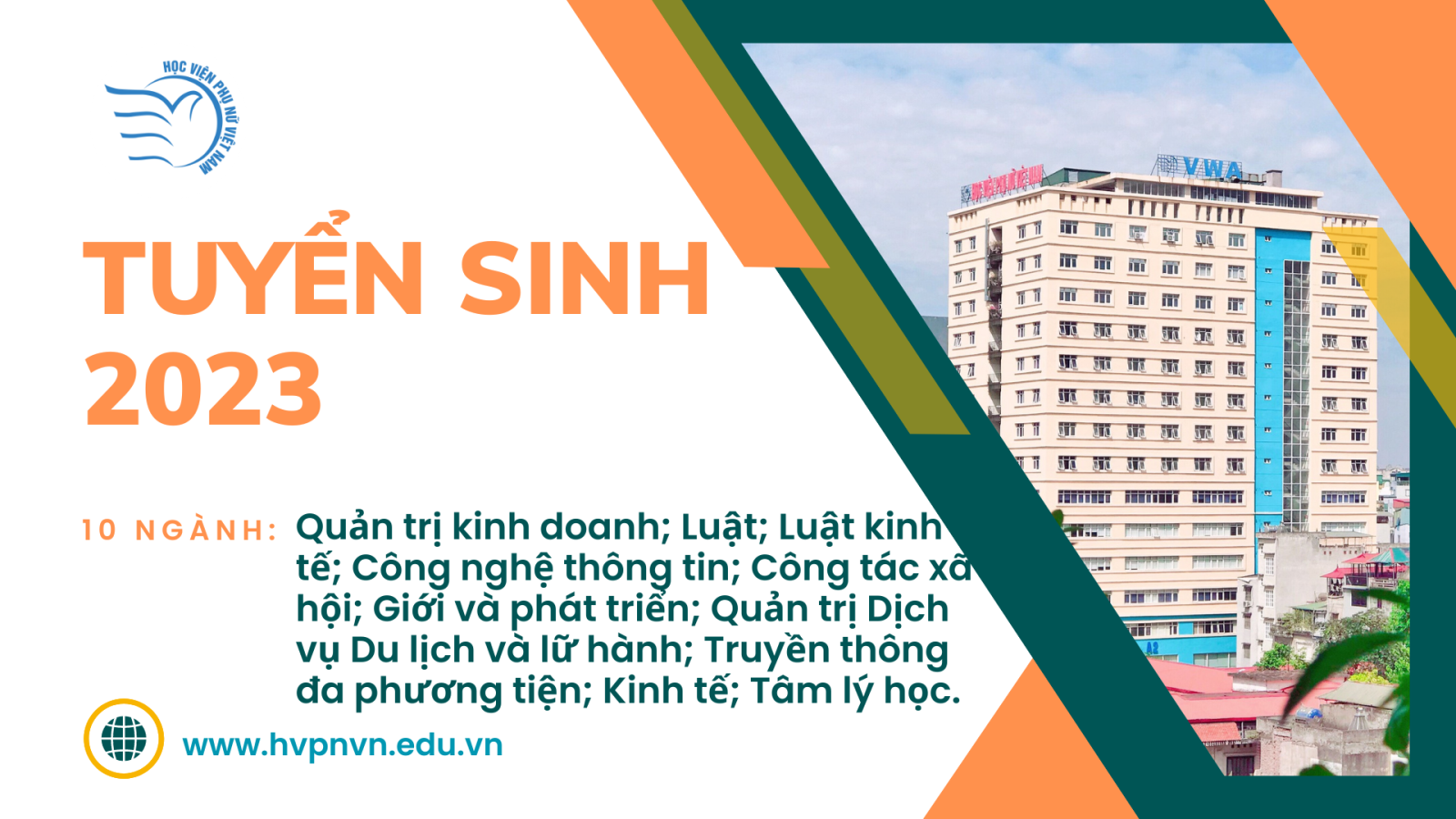 Học viện Phụ nữ Việt Nam (Học viện) là cơ sở giáo dục đại học công lập đạt chuẩn kiểm định chất lượng giáo dục quốc gia. Năm 2023, Học viện Phụ nữ Việt Nam thông báo tuyển sinh 10 ngành đại học chính quy bao gồm: Ngành Quản trị kinh doanh; Luật; Luật kinh tế; Công nghệ thông tin; Công tác xã hội; Giới và phát triển; Quản trị Dịch vụ Du lịch và lữ hành; Truyền thông đa phương tiện; Kinh tế; Tâm lý học.