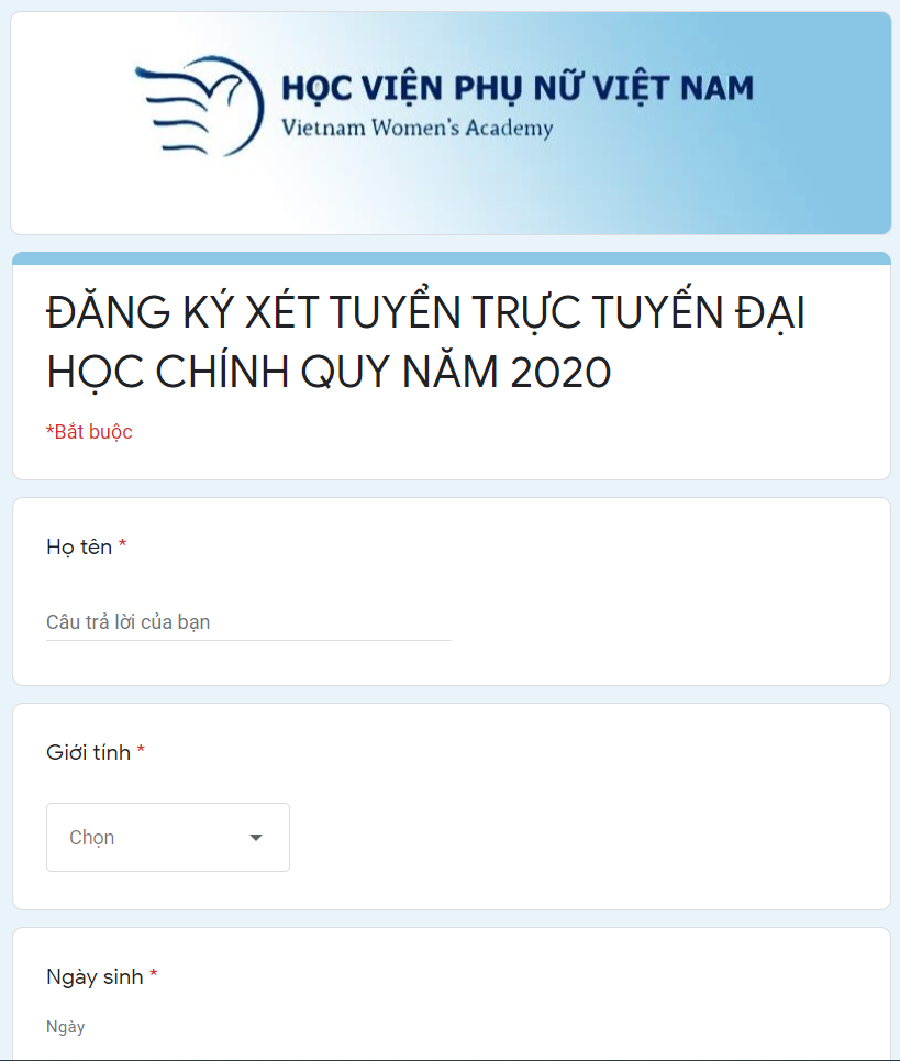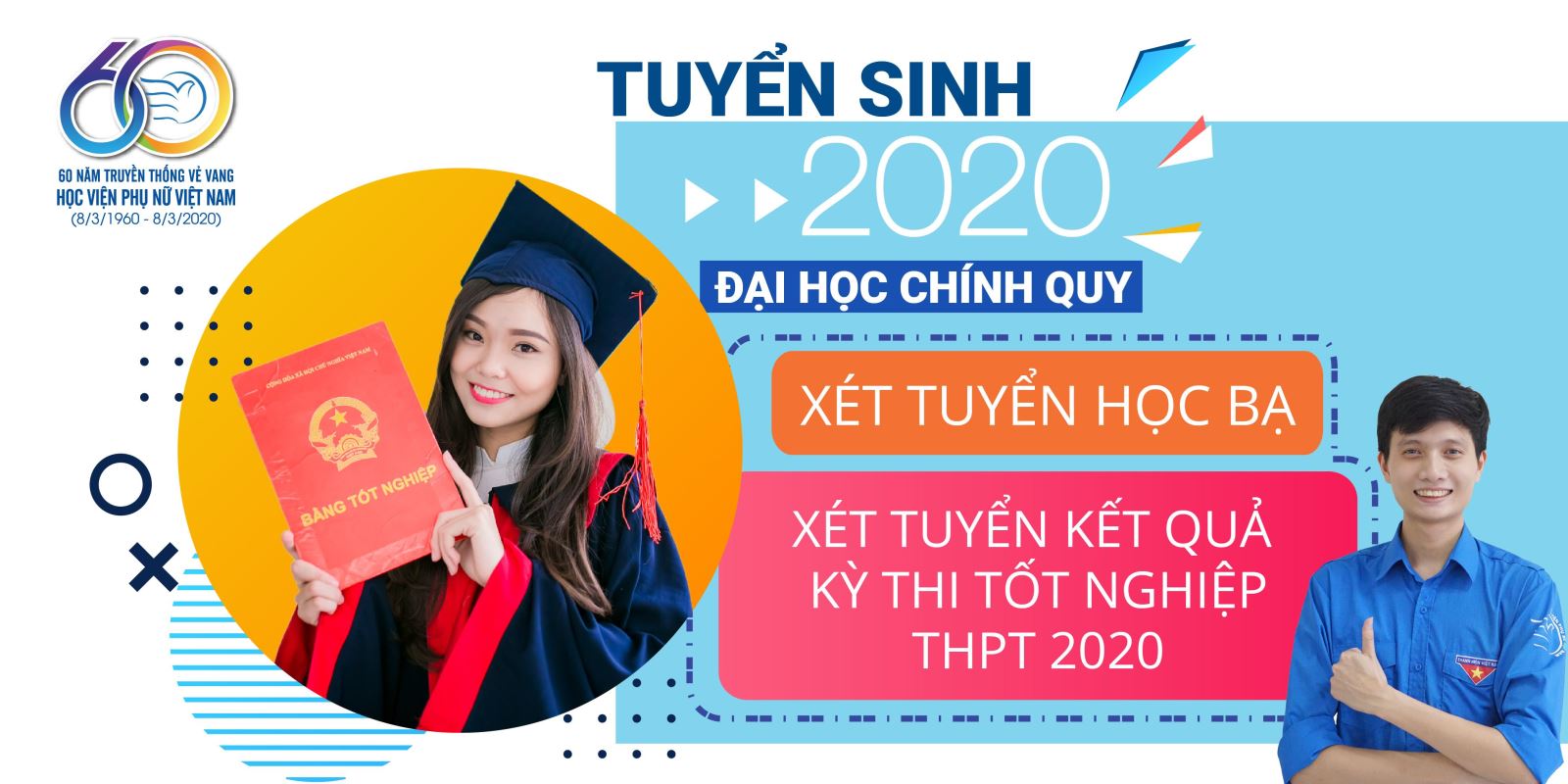 Năm 2020, Học viện Phụ nữ Việt Nam tuyển sinh 900 chỉ tiêu cho 9 ngành đại học. Ngoài hình thức xét điểm thi tốt nghiệp THPT, Học viện Phụ nữ Việt Nam có thêm 2 hình thức là xét tuyển thẳng và xét học bạ. Tất cả các hình thức xét tuyển đều được thực hiện online. Form mẫu đăng ký được thiết kế đáp ứng yêu cầu thông tin đầy đủ, minh bạch, giao diện thân thiện, dễ đăng ký. Sau khi đăng ký, thí sinh sẽ nhận được phản hồi bằng email về việc gửi hồ sơ qua bưu điện để hoàn tất thủ tục đăng ký.