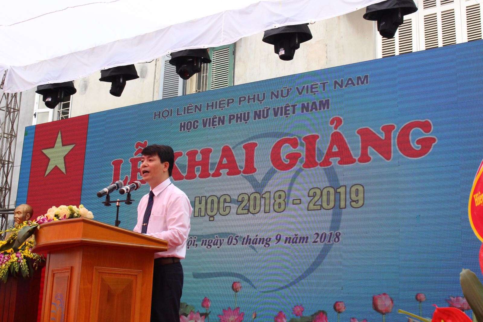 Trong không khí trang nghiêm và phấn khởi của buổi lễ, thay mặt Ban Giám đốc Học viện Phụ nữ Việt Nam tôi xin tuyên bố khai giảng năm học mới 2018-2019.