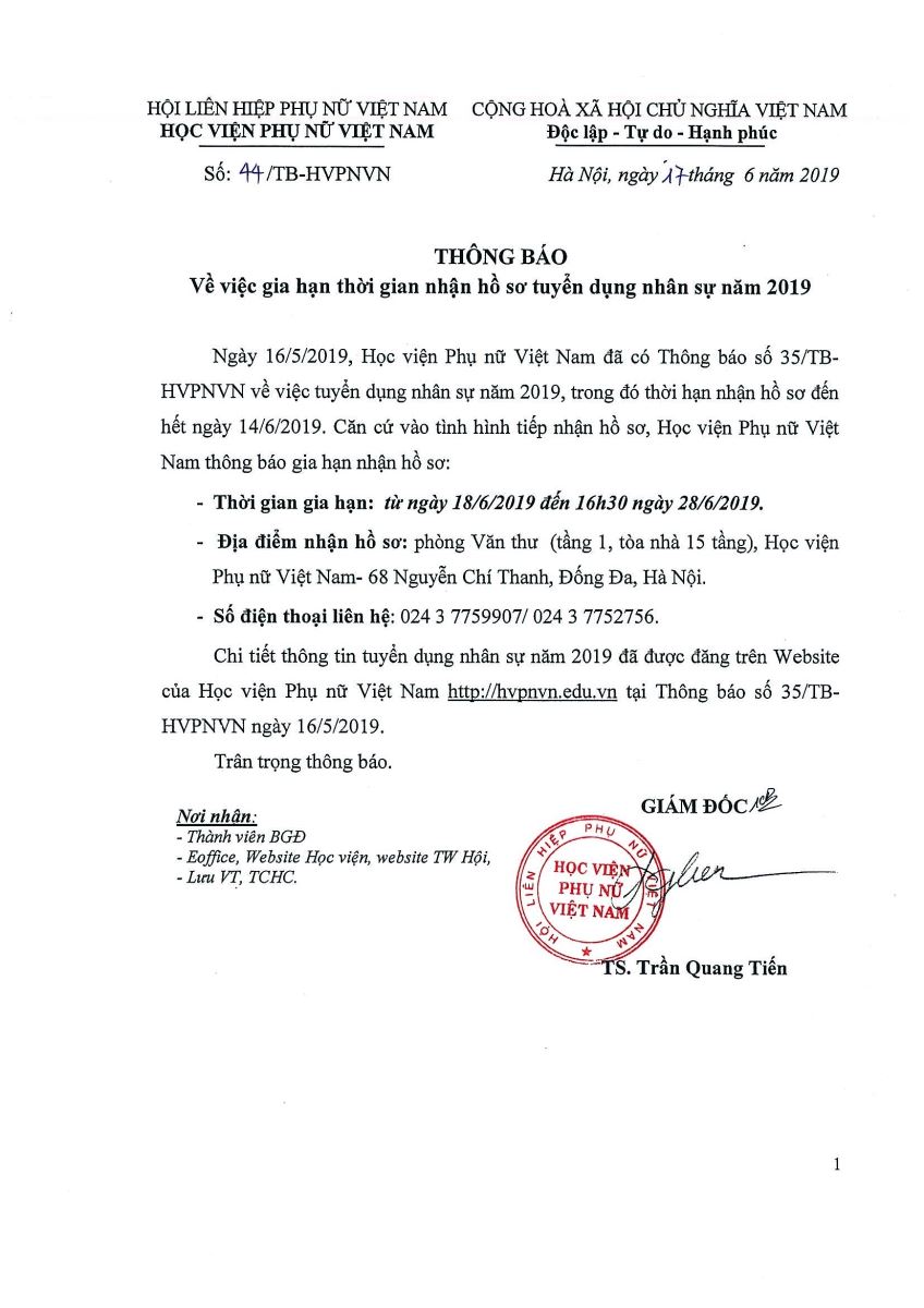 Tin tứcGia hạn thời gian nhận hồ sơ tuyển dụng năm 2019 Posted on Tháng Sáu 17, 2019 by admin(full) 17 Th6 Thông tin tuyển dụng chi tiết xem TẠI ĐÂY admin(full) Thông tin gia hạn thời gian viết bài tham dự hội thảo KHQG Học viện Phụ nữ Việt Nam tham gia phối hợp coi thi kỳ thi THPT Quốc gia năm 2019 tại tỉnh Hòa Bình