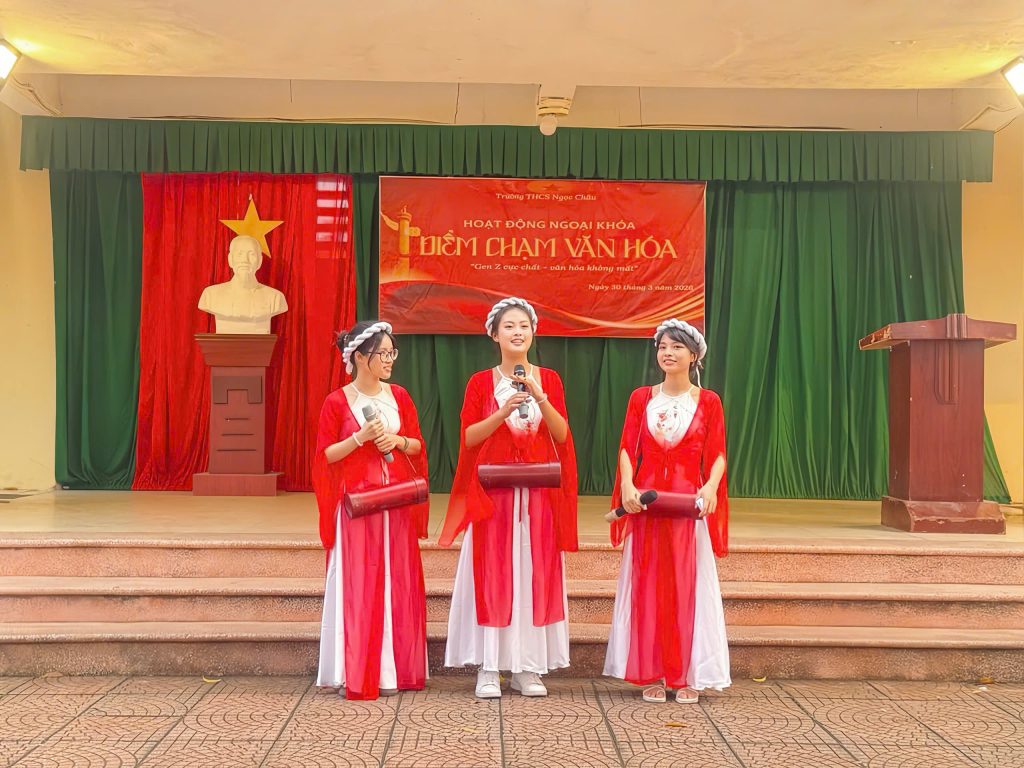 Sáng 30/3/2026, buổi ngoại khóa diễn ra trong không khí sôi nổi với sự tham gia của toàn thể học sinh nhà trường. Chương trình hướng tới mục tiêu đưa văn hóa truyền thống đến gần hơn với học sinh trung học cơ sở, nội dung chương trình được thiết kế kết hợp yếu tố giáo dục và trải nghiệm. Thay vì truyền đạt kiến thức một chiều, các hoạt động chú trọng tương tác, khuyến khích học sinh chủ động tham gia, qua đó tiếp nhận thông tin một cách tự nhiên. Chương trình đặt trọng tâm vào việc nâng cao nhận thức về giá trị văn hóa Việt Nam bằng những hình thức truyền tải mới mẻ, kết hợp hài hòa giữa hiện đại và bản sắc dân tộc, góp phần nuôi dưỡng tinh thần tự hào và ý thức gìn giữ văn hóa trong môi trường học đường.