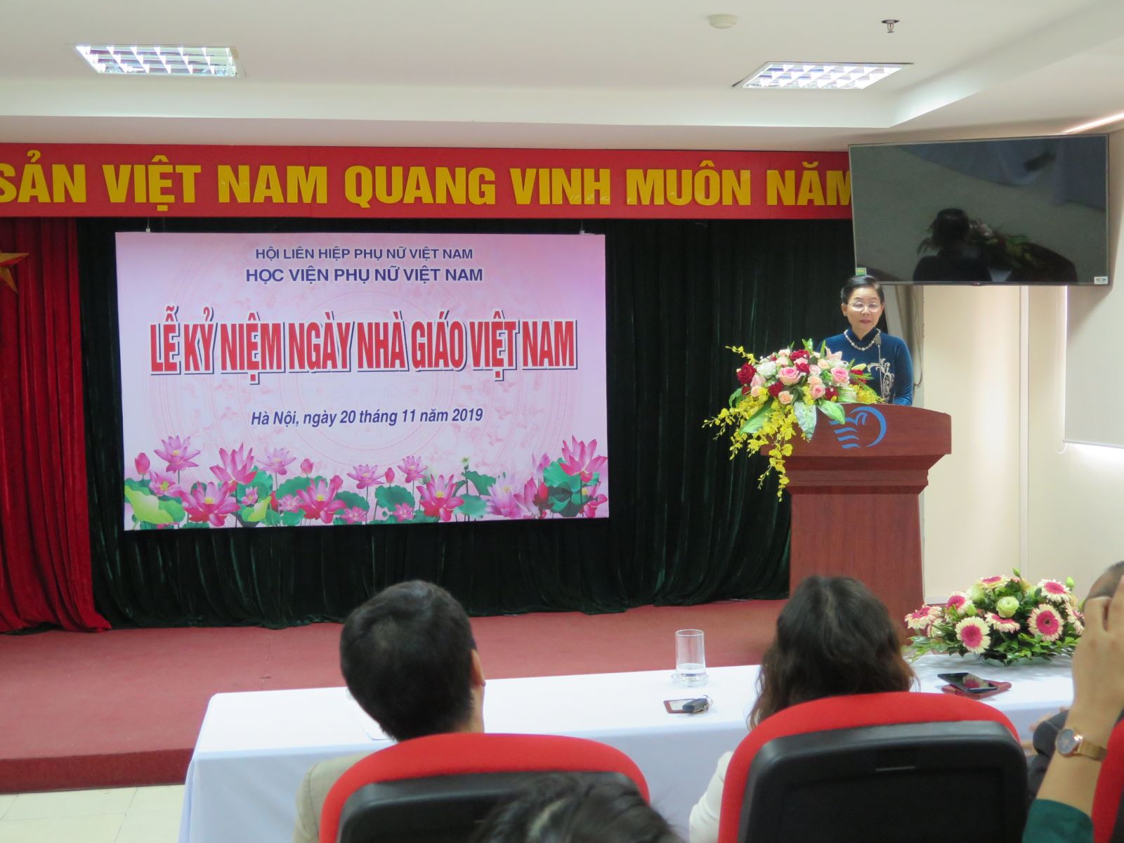 ThS. Trần Thị Hương gửi lời chúc mừng đến tập thể cán bộ, giảng viên Học viện và bày tỏ sự tin tưởng với truyền thống gần 60 năm phát triển, với nguồn tri thức dồi dào, lòng yêu nghề sâu sắc cùng tinh thần nhiệt huyết, sức trẻ, sự sáng tạo của các thầy cô sẽ đưa Học viện Phụ nữ Việt Nam ngày càng phát triển mạnh mẽ và vững vàng; đóng góp ngày càng thiết thực hơn cho các hoạt động của Hội Liên hiệp Phụ nữ Việt Nam.