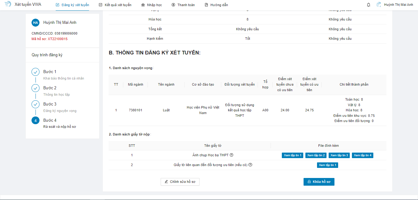 Bước 11: Thí sinh xem thật kĩ thông tin cá nhân, phương thức xét tuyển, điểm xét tuyển, nguyện vọng của mình trước khi Khoá hồ sơ.