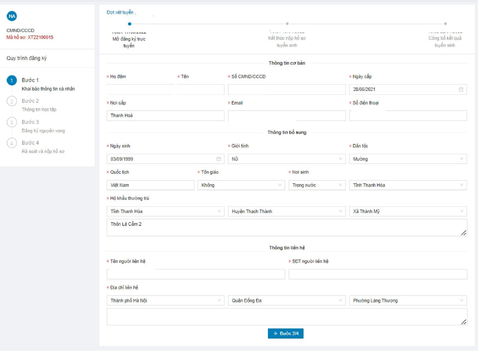 Bước 8: Thí sinh khai đầy đủ, trung thực thông tin cá nhân. Phần Thông tin liên hệ, thí sinh lưu ý ghi rõ ràng từ số nhà, đường, phố, thôn/xóm/phố/tổ/đội chi tiết để Học viện có đầy đủ thông tin liên hệ khi cần thiết. Thí sinh lưu ý nhớ Mã Hồ sơ (Chữ đỏ) để có thắc mắc thì đội ngũ tư vấn tuyển sinh có thể giải đáp.