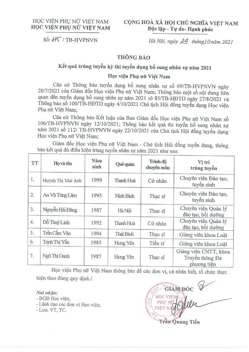 Tin tứcKết quả trúng tuyển kỳ thi tuyển dụng nhân sự bổ sung năm 2021 Posted on Tháng Mười Một 1, 2021 by admin(full) 01 Th11 admin(full) Thông báo hoàn trả học phí do nộp sai quy định Quyết định công nhận Ban cán sự các lớp năm học 2021 – 2022