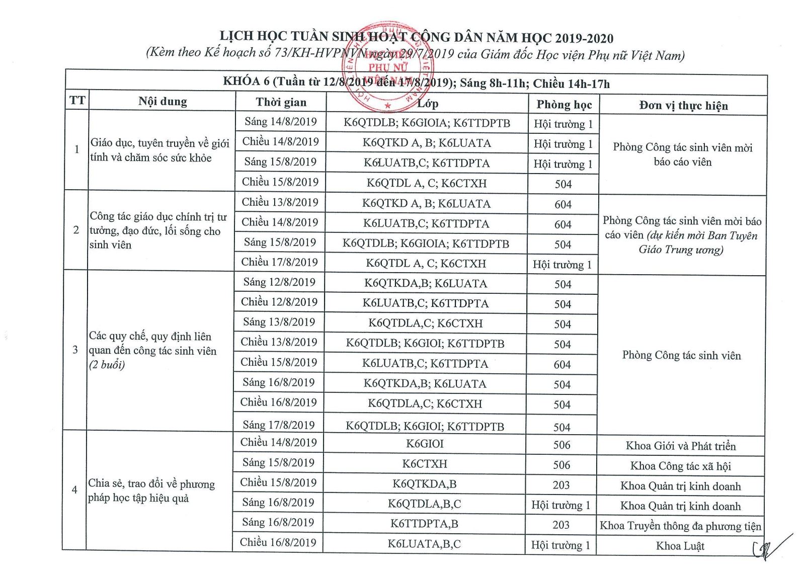 Lịch học tuần sinh hoạt công dân dành năm học 2019 - 2020