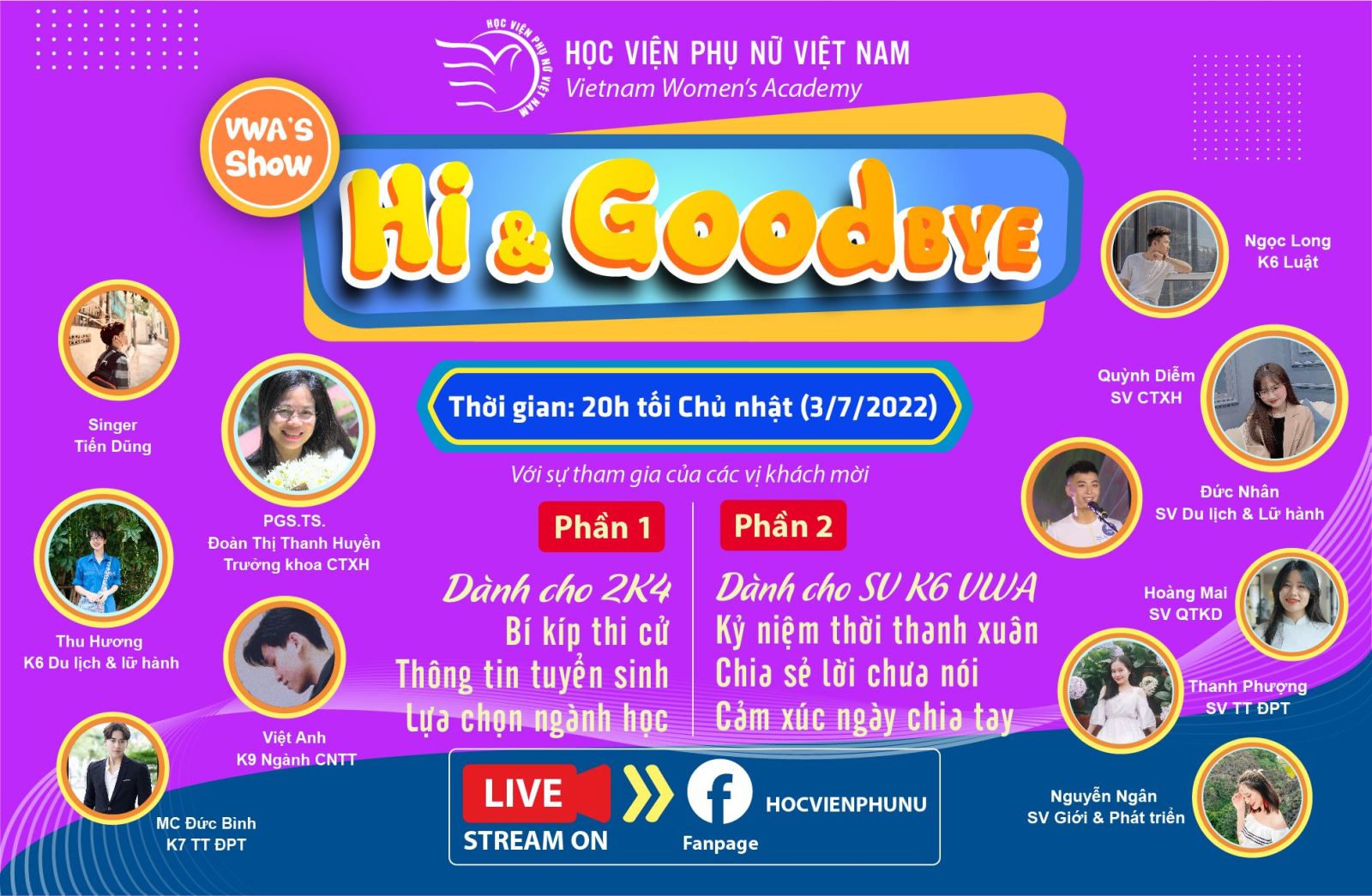 Mời các bạn cùng theo dõi Livestream HI & GOODBYE! trên Fanpage: Học viện Phụ nữ Việt Nam vào 20h tối Chủ nhật, ngày 3/7/2022.
