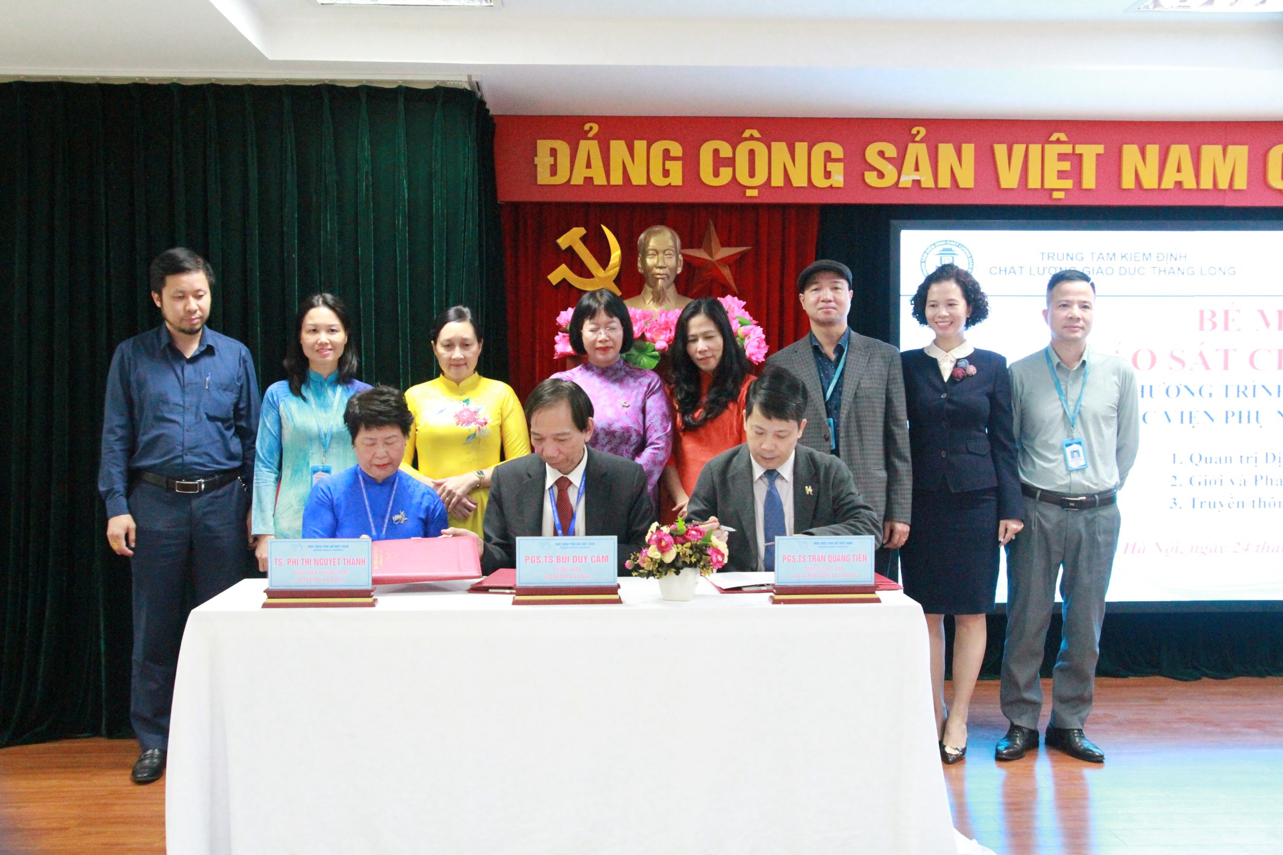 PGS.TS Bùi Duy Cam – Trưởng đoàn đánh giá ngoài, TS. Phí Thị Nguyệt Thanh – Phó Giám đốc Trung tâm Kiểm định chất lượng giáo dục Thăng Long, thành viên thường trực đoàn và PGS.TS Trần Quang Tiến – Giám đốc Học viện Phụ nữ Việt Nam kí biên bản ghi nhận kết quả đánh giá sơ bộ.