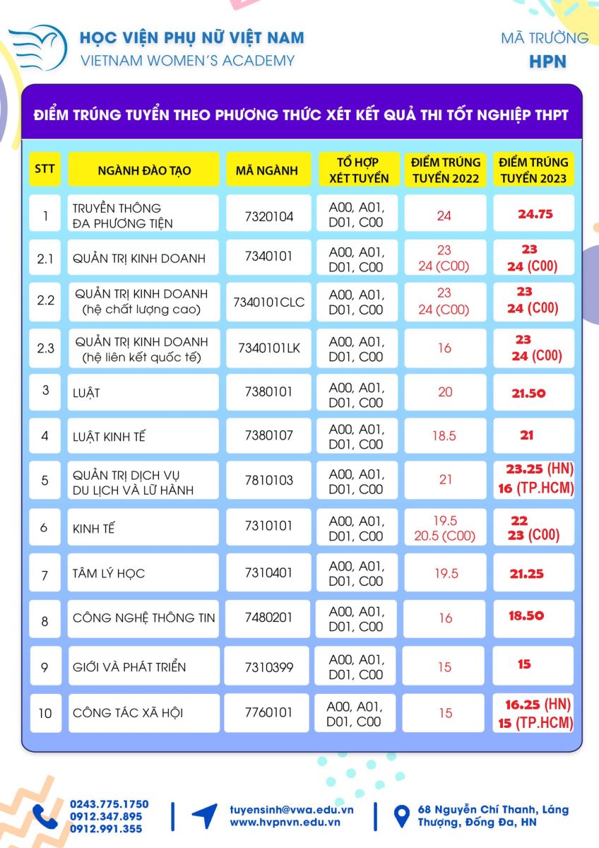 Nhìn chung, mức điểm trúng tuyển năm 2023 của Học viện Phụ nữ Việt Nam có xu hướng tăng rõ rệt, ngành tăng nhiều nhất lên đến 2,5đ. Với 10 ngành đào tạo thì có tới 8 ngành tăng điểm trúng tuyển, điều này chứng tỏ chất lượng đầu vào của Học viện ngày càng được nâng cao.