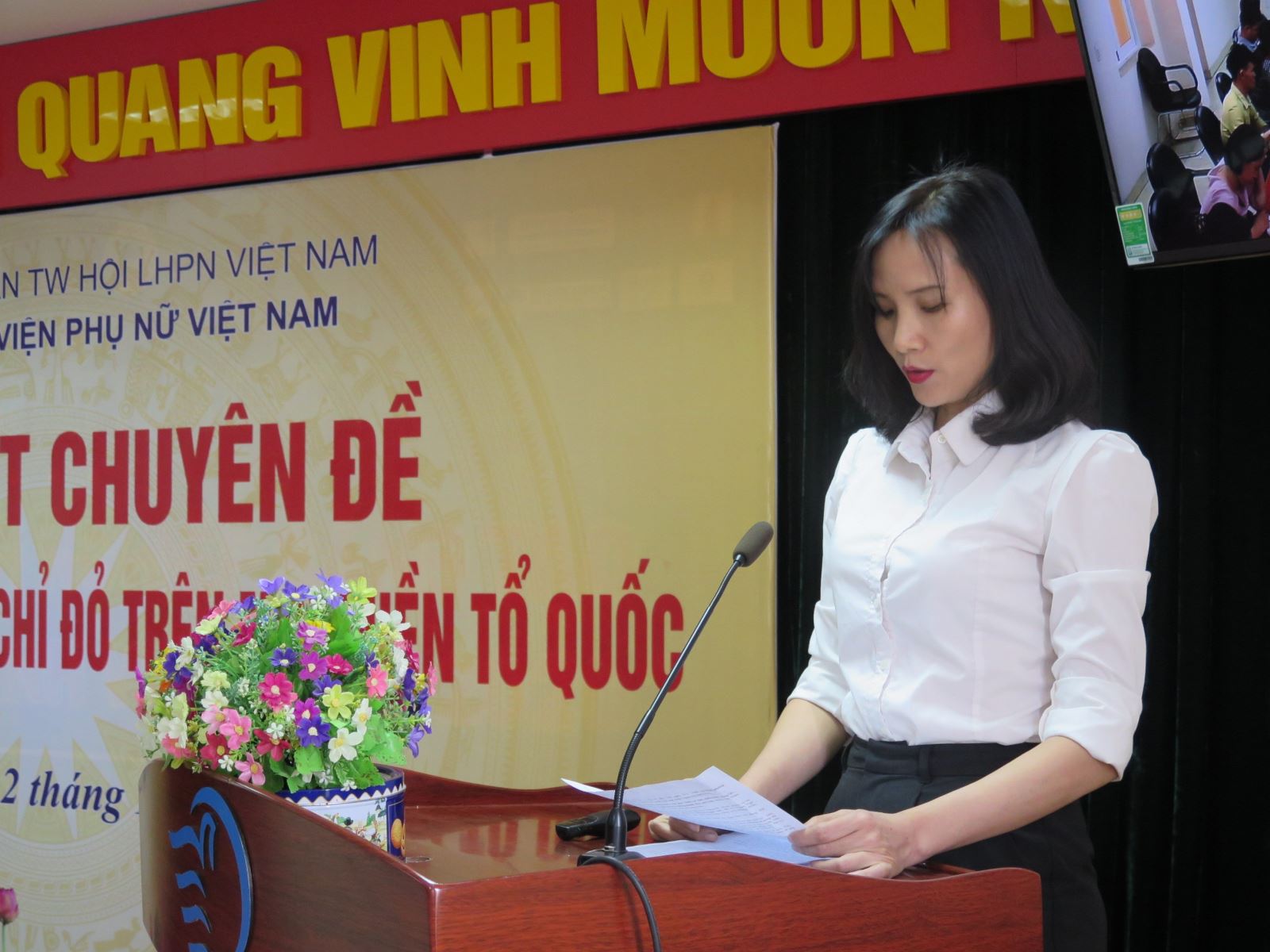 Đồng chí Nguyễn Thị Thu Hương – Bí thư Chi bộ 5 Phân hiệu Học viện Phụ nữ Việt Nam tại TP. Hồ Chí Minh trình bày tham luận: Căn cứ Trung ương Cục miền Nam – nơi Hội Liên hiệp Phụ nữ Giải phóng miền Nam ra đời