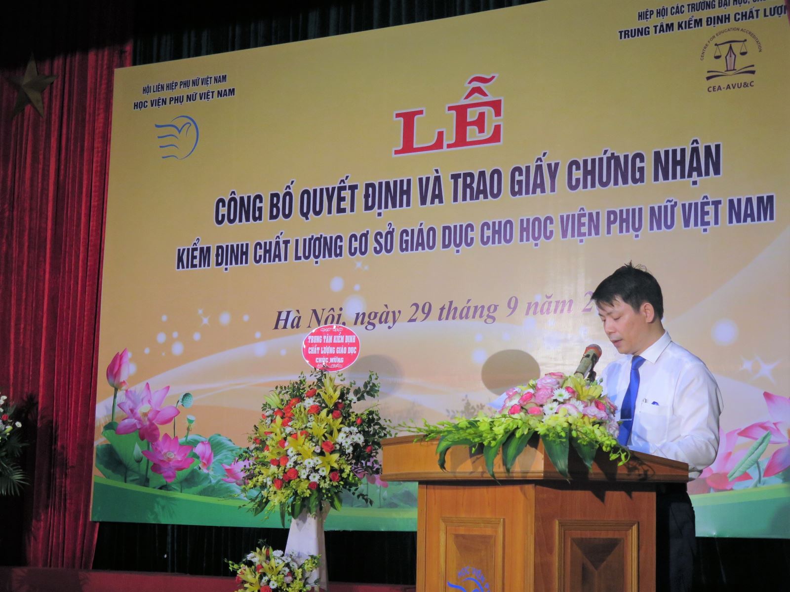 Hôm nay, Học viện Phụ nữ Việt Nam long trọng tổ chức Lễ Công bố quyết định và trao chứng nhận kiểm định chất lượng cơ sở giáo dục đại học theo quy định của nhà nước Việt Nam. Đây vừa là một sự kiện quan trọng vừa là một thành tích đáng ghi nhận của Học viện, góp phần lập thành tích chào mừng 60 năm ngày truyền thống Học viện và 8 năm thành lập Học viện Phụ nữ Việt Nam. Thay mặt Đảng ủy, BGĐ và toàn thể viên chức Học viện, tôi xin gửi tới các đồng chí lãnh đạo Hội, các quý vị đại biểu, khách quý những lời chúc tốt đẹp nhất; chúc cho buổi lễ của chúng ta sẽ thành công tốt đẹp.