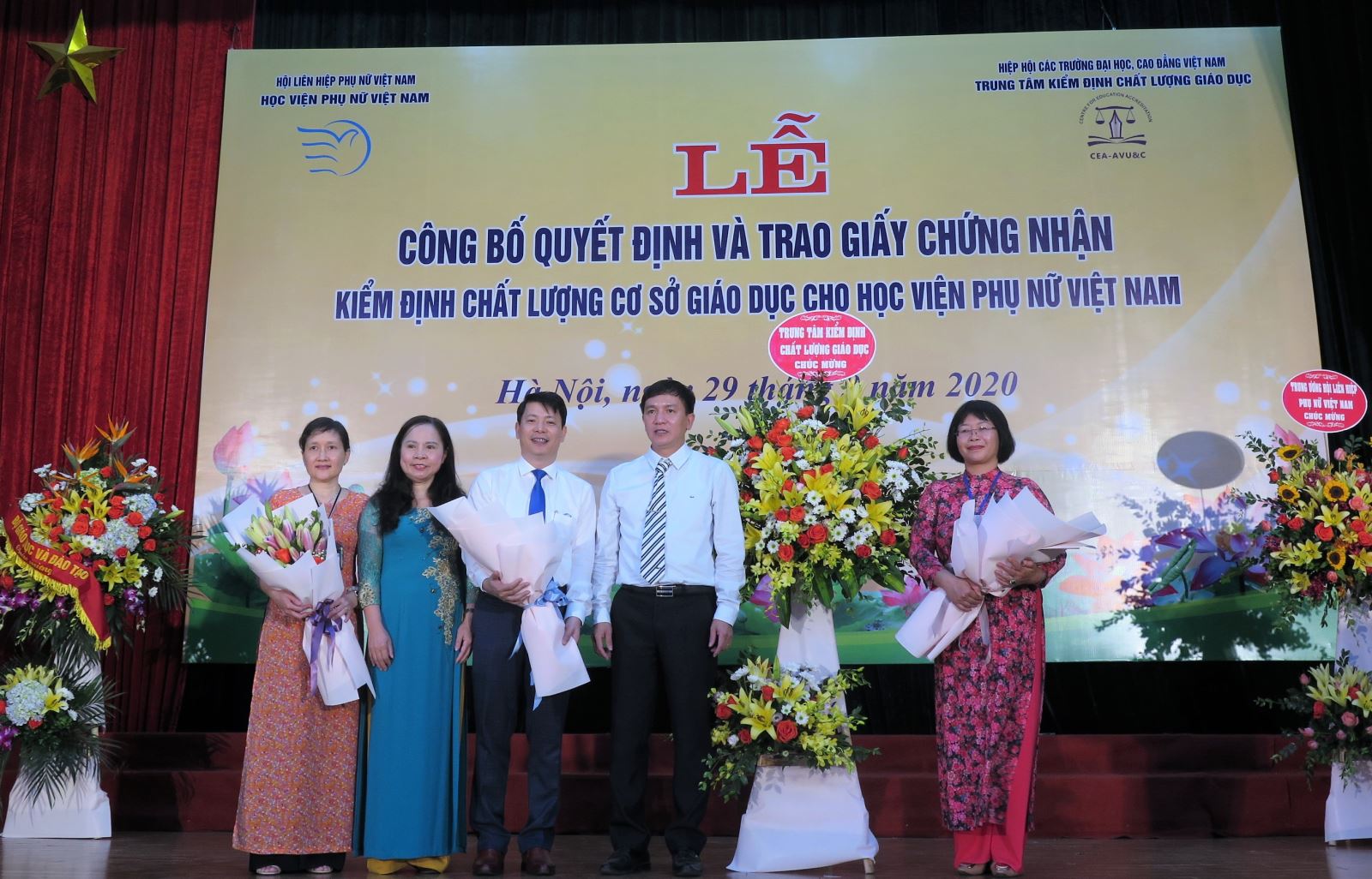 Ban Giám đốc Học viện Phụ nữ Việt Nam nhận giấy chứng nhận và hoa chúc mừng từ đại diện Bộ GD & ĐT và TT Kiểm định chất lượng GD – Hiệp hội các trường CĐ ĐH Việt Nam