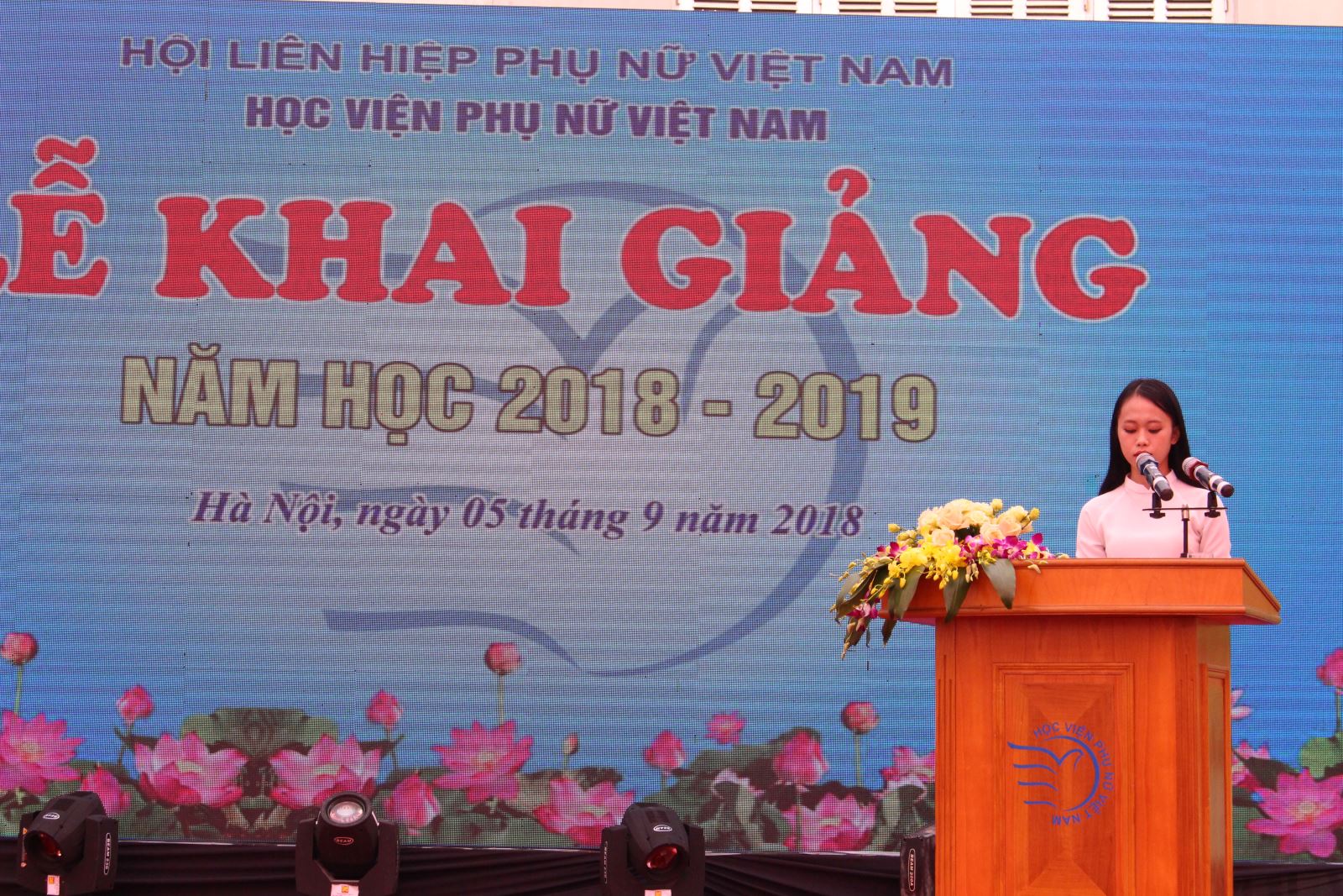 Tân sinh viên K6 Ngọc Nga đại diện sinh viên học viện phát biểu tại lễ khai giảng