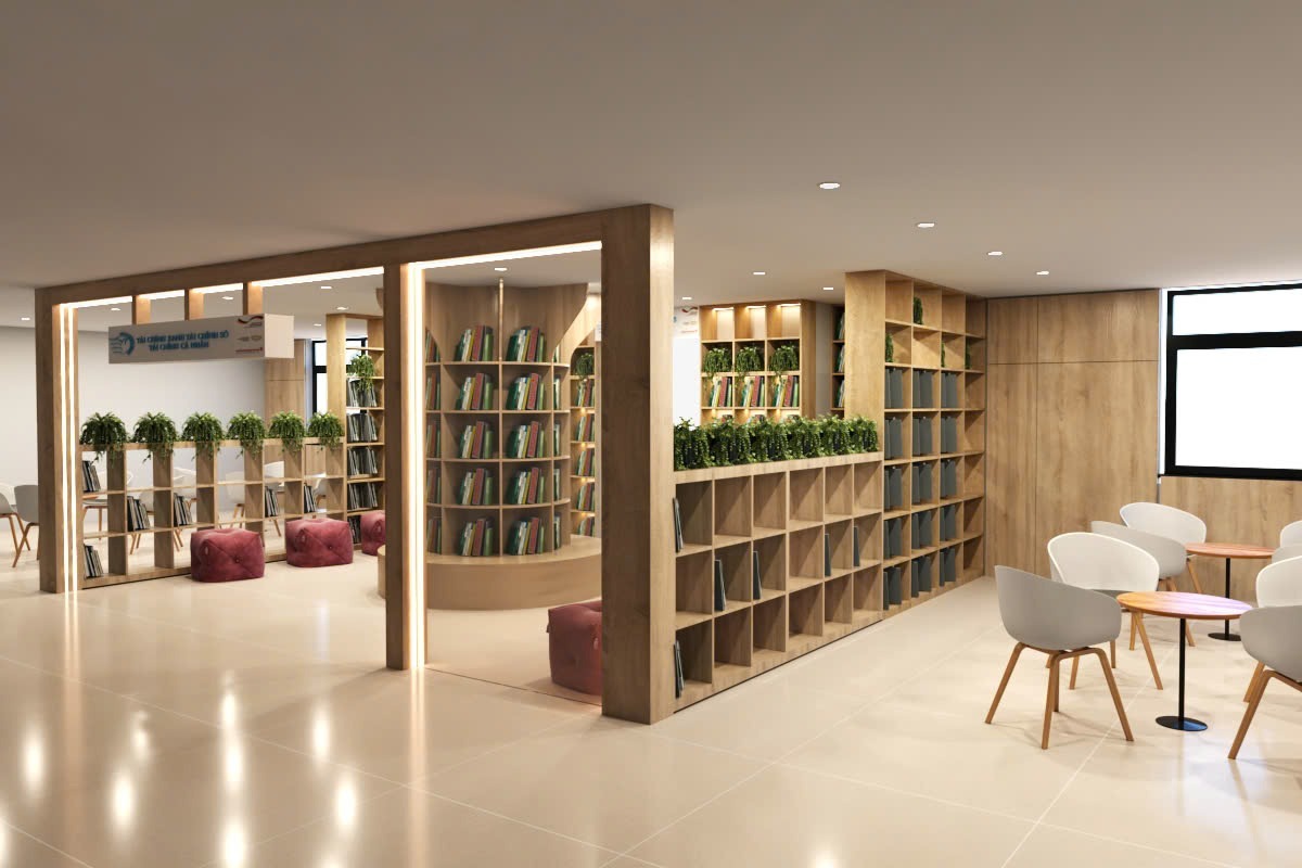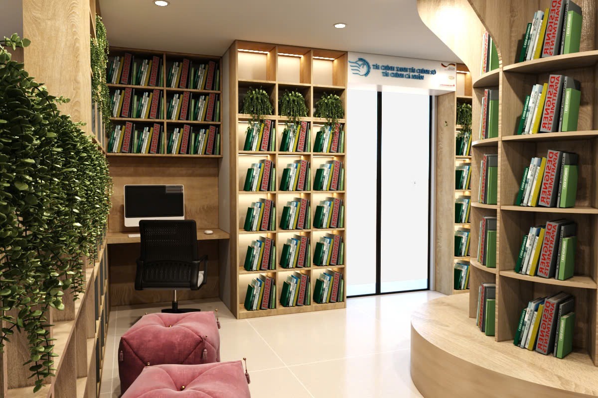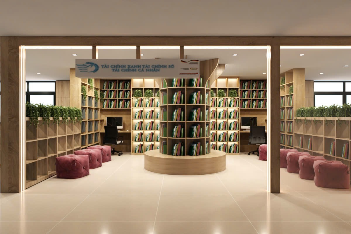 Quầy sách gây ấn tượng với thiết kế hiện đại, không gian mở và sự hài hòa giữa yếu tố thiên nhiên và công nghệ. Đây là một không gian xanh kết hợp số hóa được thiết kế với sự tinh tế, đổi mới và thân thiện. Những giá sách được bố trí hình tròn trung tâm, với các đầu sách đa dạng về tài chính xanh, tài chính số, và tài chính cá nhân. Không gian được trang trí bằng cây xanh, mang lại cảm giác thư thái, dễ chịu cho người học. Đặc biệt, các máy tính được trang bị tại đây cho phép sinh viên truy cập nhanh chóng vào các tài liệu số, nghiên cứu các xu hướng tài chính hiện đại.