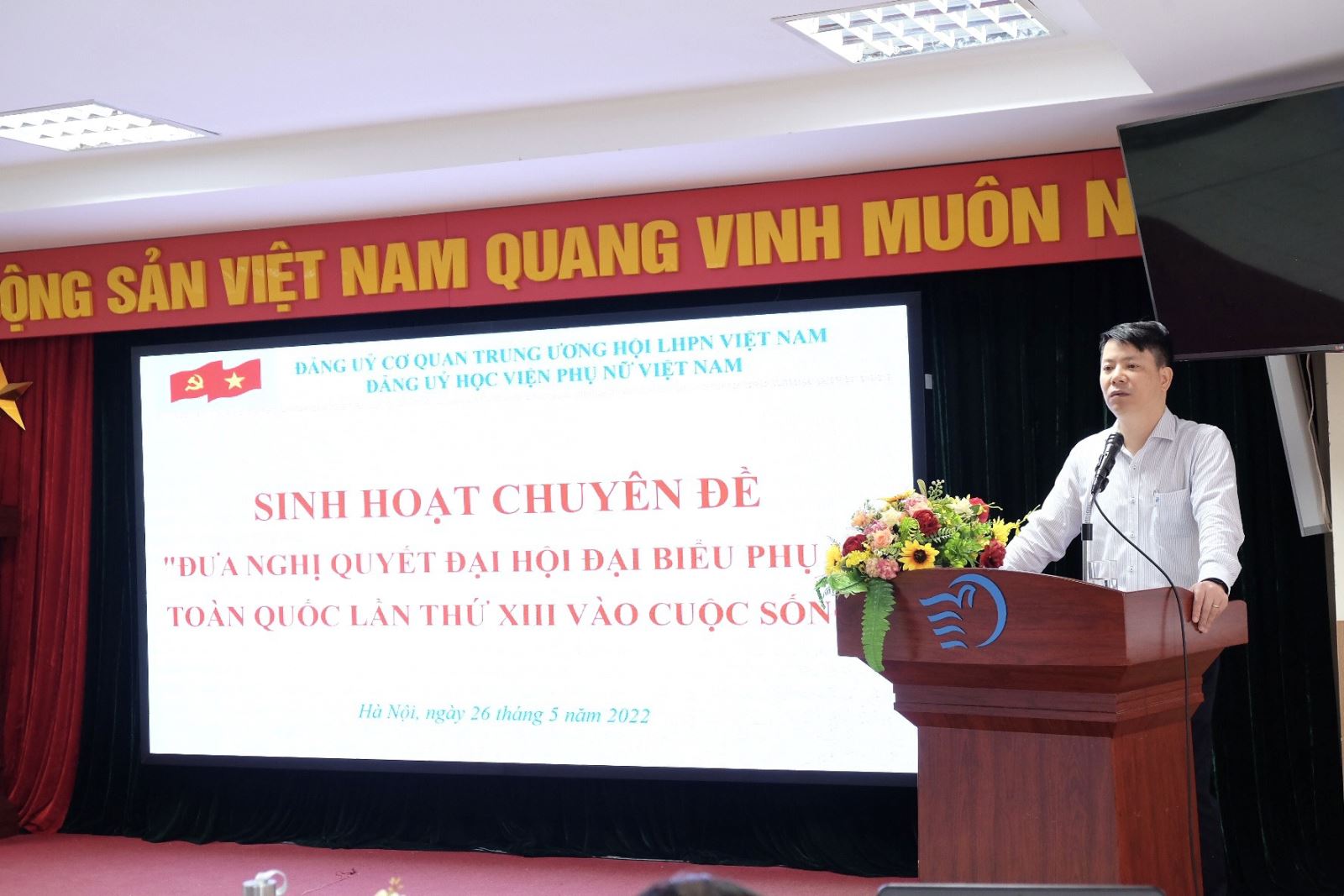 Phát biểu khai mạc buổi sinh hoạt, đồng chí Trần Quang Tiến – Bí thư Đảng bộ, Giám đốc Học viện Phụ nữ Việt Nam khẳng định tầm quan trọng của việc hiện thực hóa Nghị quyết Đại hội Phụ nữ toàn quốc lần thứ XIII vào từng mảng công việc và đời sống của mỗi đảng viên, quần chúng nói riêng và đảng bộ Học viện nói chung. Không chỉ vậy, đồng chí còn khẳng định và mong muốn giá trị của những tham luận chia sẻ tại buổi sinh hoạt chuyên đề được nâng cao hơn nữa khi từng vấn đề, giải pháp được áp dụng triệt để trong công việc thực tế.