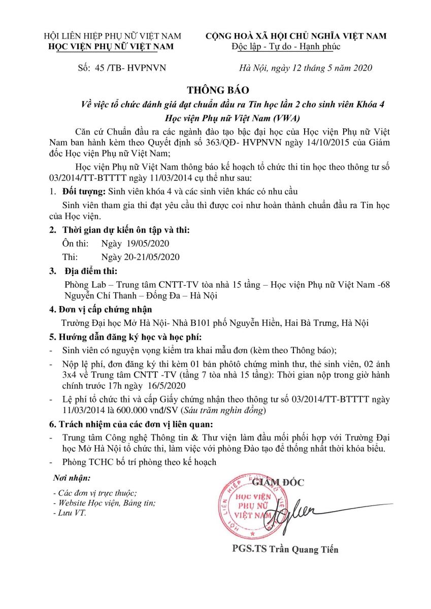 Thông báo lịch đánh giá đạt chuẩn đầu ra Tin học lần 2 dành cho SV khóa 4