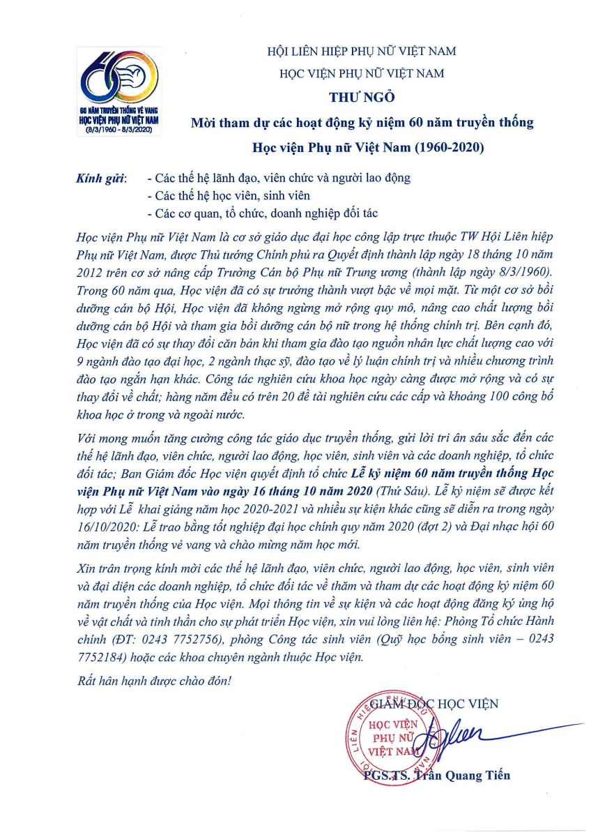 Tin tứcThư ngỏ mời tham dự kỷ niệm 60 năm truyền thống Học viện Phụ nữ Việt Nam Posted on Tháng Mười 7, 2020 by admin(full) 07 Th10 admin(full) THÔNG BÁO ĐIỂM TRÚNG TUYỂN ĐẠI HỌC NĂM 2020 Quy định công nhận giá trị chuyển đổi kết quả học tập liên thông giữa trung cấp, cao đẳng với đại học