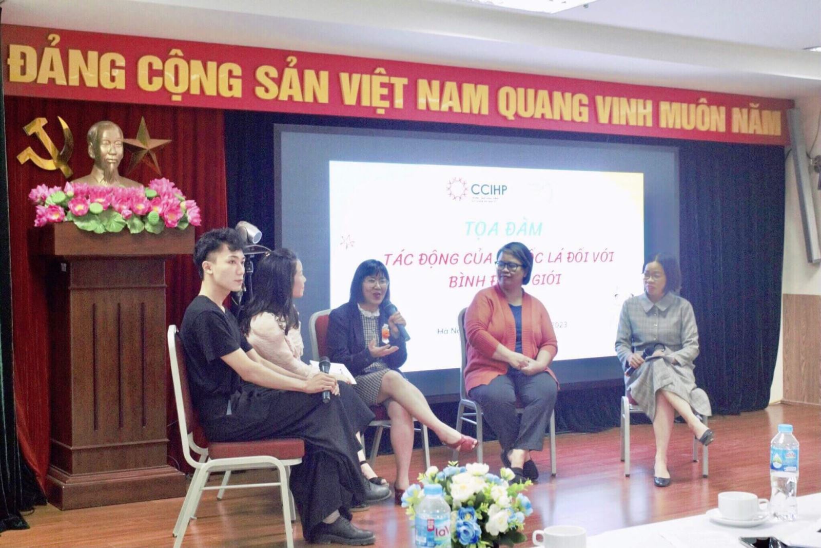 Buổi toạ đàm có sự tham dự của PGS.TS. Trần Quang Tiến – Giám đốc Học viện Phụ nữ Việt Nam; TS.Bs. Hoàng Tú Anh – Giám đốc Trung tâm Sáng kiến Sức khỏe và Dân số (CCIHP); Ths. Huỳnh Lan Phương – Cố vấn kỹ thuật về công tác phòng chống tác hại thuốc lá của tổ chức Vital Strategies; TS. Nguyễn Thị Thanh Thủy – Phó Trưởng Khoa Truyền thông đa phương tiện và giảng viên, sinh của Khoa.