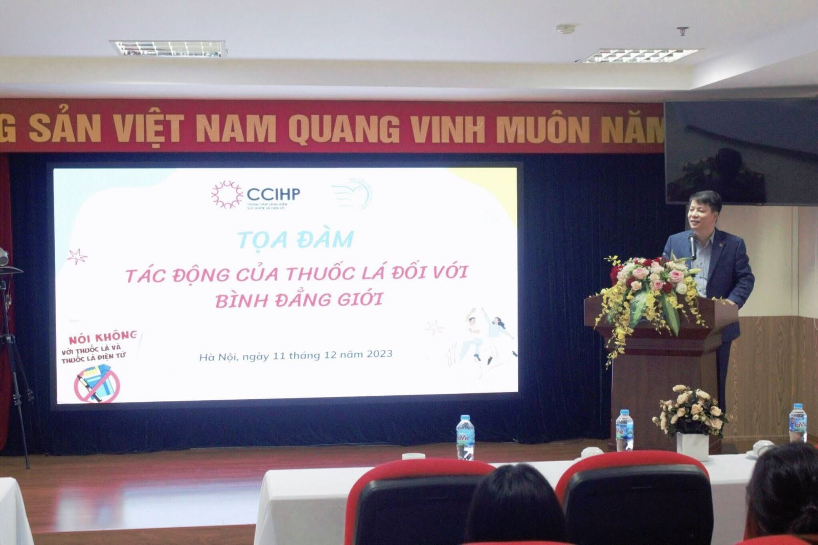 Thay mặt Ban tổ chức, TS.BS. Hoàng Tú Anh – Giám đốc CCIHP gửi lời cảm ơn tới Khoa Truyền thông đa phương tiện, Học viện Phụ nữ Việt Nam và toàn thể giảng viên, sinh viên đã đến tham dự buổi tọa đàm, đồng thời hi vọng buổi tọa đàm giúp sinh viên Học viện có thêm kiến thức về tác hại của thuốc lá đối với bình đẳng giới, từ đó thúc đẩy sinh viên có những hành động cụ thể để làm giảm bất bình đẳng giới thông qua công tác phòng chống tác hại thuốc lá.