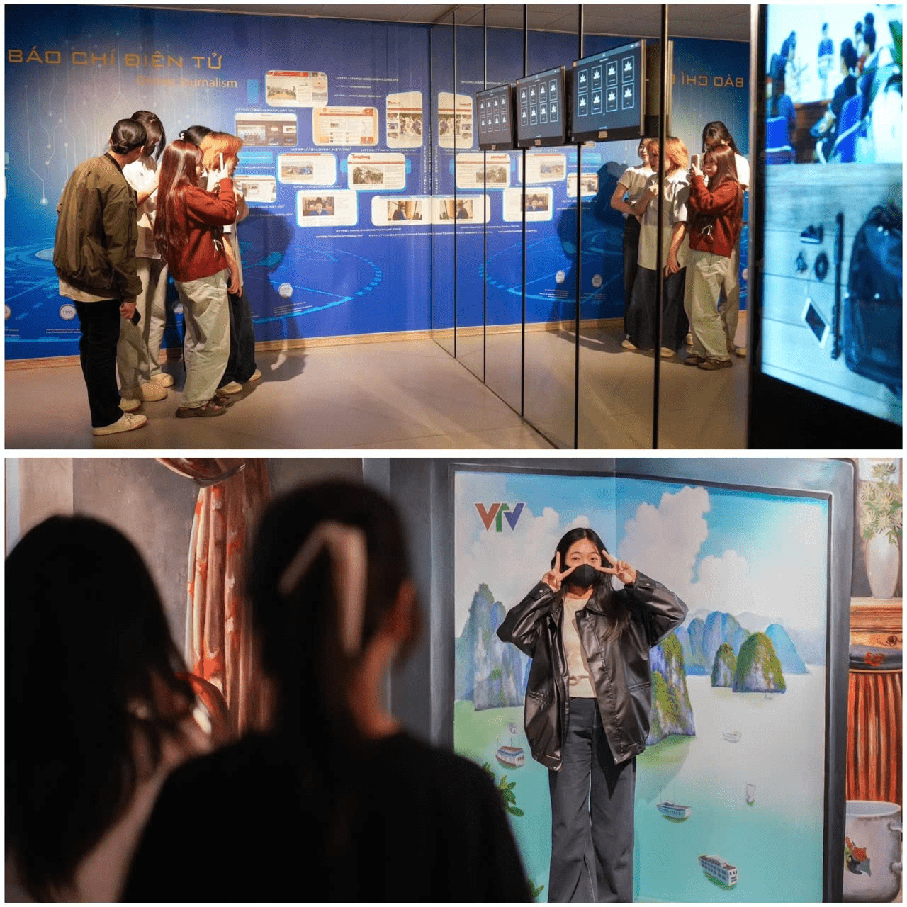 Không chỉ dừng lại ở việc tham quan, sinh viên còn được trải nghiệm thực hành truyền thông qua các hoạt động tương tác như: thử đọc bản tin trước ống kính máy quay, tham gia dàn trang một tờ báo giấy, hoặc sử dụng công nghệ AR để xem lại những sự kiện báo chí nổi bật… Những trải nghiệm này đã giúp sinh viên hiểu hơn về quy trình làm báo và sự tích hợp giữa công nghệ với nội dung trong báo chí truyền thông hiện đại.