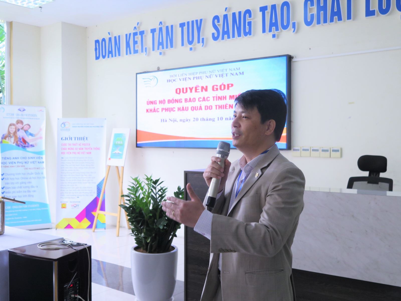Phát biểu tại buổi lễ vận động ủng hộ diễn ra vào ngày 20/10/2020, PGS.TS. Trần Quang Tiến – Bí thư Đảng ủy, Giám đốc Học viện đã bày tỏ tinh thần chia sẻ những mất mát, khó khăn đối với đồng bào miền Trung trong đó có không ít người thân của cán bộ nhân viên và sinh viên của Học viện. Đồng chí mong muốn với tinh thần tương thân tương ái, cán bộ, nhân viên và sinh viên Học viện sẽ cùng chung sức để hỗ trợ đồng bào vượt qua giai đoạn khó khăn này. Ngoài việc ủng hộ bằng vật chất, tình cảm gửi trực tiếp đến đồng bào miền Trung, Giám đốc Trần Quang Tiên cũng lưu ý những trường hợp là sinh viên Học viện có gia đình chịu ảnh hưởng nặng nề của bão lũ cũng sẽ được nhà trường miễn, giảm học phí tùy theo tình hình thiệt hại thực tế. Sự sẻ chia của cán bộ, nhân viên, sinh viên học viện sẽ là nguồn động lực để làm vơi bớt những đau thương, mất mát, góp phần nhanh chóng khôi phục sản xuất và đổn định đời sống của người dân vùng bị bão lũ, thiên tai.