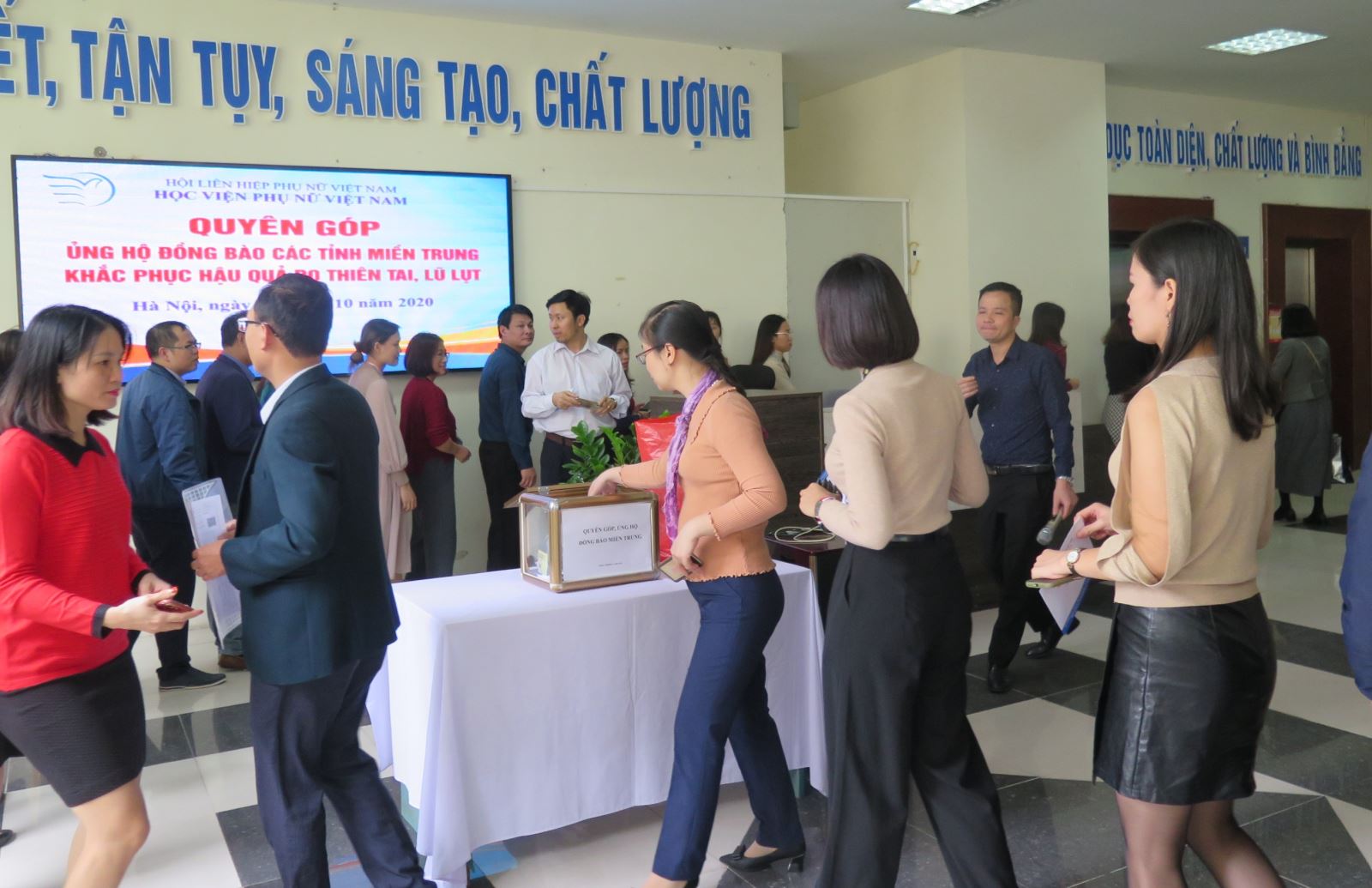 Hưởng ứng tinh thần đó, tập thể cán bộ, nhân viên, sinh viên của Học viện Phụ nữ Việt Nam đã tự nguyện đóng góp những món quà vật chất để gửi tới đồng bào miền Trung ruột thịt.