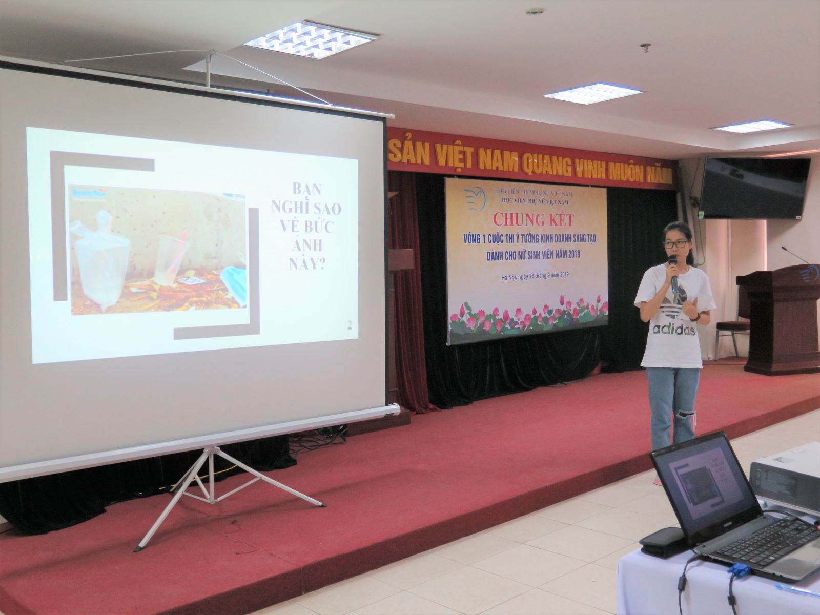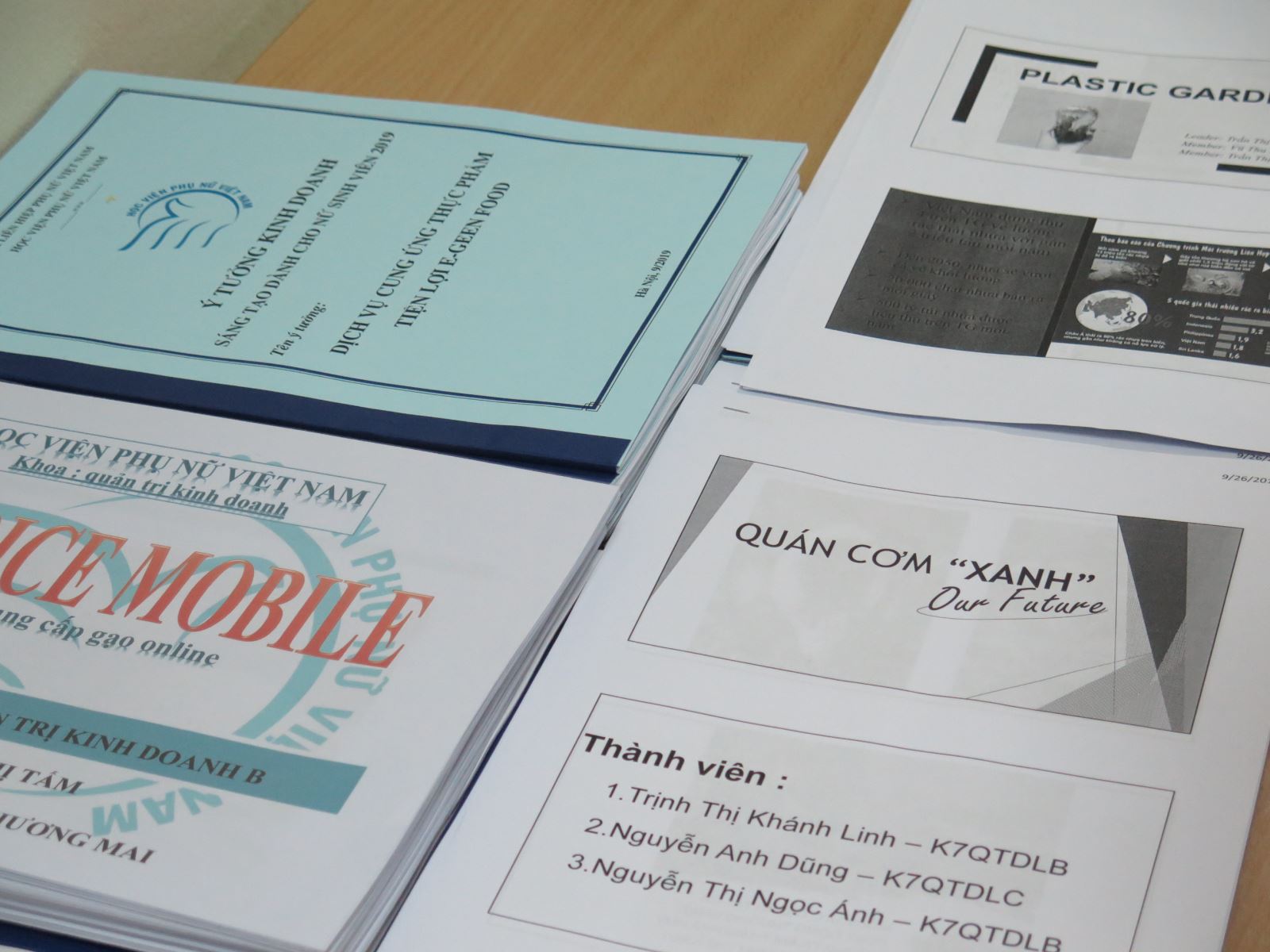 Tham gia vòng chung kết cuộc thi Ý tưởng khởi nghiệp sáng tạo dành cho nữ sinh viên 2019 cấp Học viện là 7 ý tưởng được sinh viên học viện chuẩn bị kỹ lưỡng và vượt qua rất nhiều các ý tưởng kinh doanh ở vòng sơ loại: Plastic Garden – Vườn xanh từ phế thải nhựa – K7 QTDLB; Quán cơm xanh – K7QTDLB; Kinh doanh cửa hàng dịch vụ giải trí,thư giãn “Refresh life”- K5QTKDB; Dịch vụ cung ứng thực phẩm tiện lợi E-Green Food – K6QTKDA; Sky Rice Mobile – Giải pháp cung cấp gạo online – K5QTKDB; Coffee Bag – Túi xách làm từ bã coffee và nhựa phế thải – K6QTKDB.