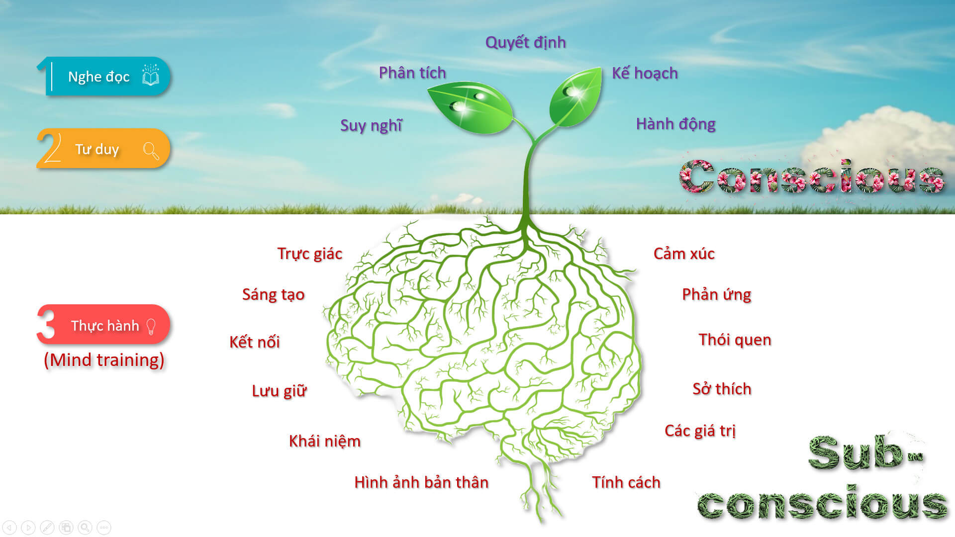 GS.TS. Trần Ngọc Anh cũng đặc biệt tập trung vào việc phân biệt cái Biết, sự Sáng tạo và Trực giác trong mỗi người để từ đó giúp mỗi người xác định được: Khi nào sử dụng trực giác? Ở môi trường, hoàn cảnh nào thì sự sáng tạo khai phóng? Sử dụng và phát triển cái ta Biết như thế nào? Mỗi câu hỏi đều hướng đến sự hòa quyện, gắn kết của các yếu tố hình thành đời sống của mỗi người chính là: Hạnh phúc – Trí tuệ – Nhiệt huyết. Những yếu tố này được hình thành từ bản thể của mỗi người sau quá trình nghe, đọc, tư duy và thực hành. Sự kết hợp giữa cảm xúc, phản ứng, thói quen, sở thích, tính cách và trực giác, sự sáng tạo, sự kết nối, sự lưu giữ khái niệm, hình ảnh bản thân của 2 bán cầu não tạo thành một thói quen thực hành, vận động không ngừng. Chính nền tảng này kết hợp với sự tiếp nhận thông tin, kiến thức sau quá trình nghe, đọc và tư duy đã thúc đẩy suy nghĩ, hình thành quá trình phân tích, từ đó đưa ra quyết định, lập kế hoạch và hành động. Những hành động xuất phát từ sự thấu hiểu của một tâm hồn an yên, bình thản trước những khó khăn của cuộc đời chắc chắn là những hành động mang lại hạnh phúc cho chính mình và mọi người.
